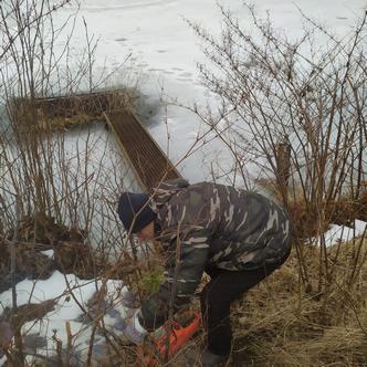 Jako uragán se pustil o víkendu do práce Radim Landecki a využil zamrzlé plochy k úpravě lovných míst ořezem větví motorovou pilou. Mohutně mu pomáhala šelma, která si na to vzala modřoky. Bohužel, naši pracanti objevili i zbytek vydří svačinky. Vydra obrala statného kapříka jak pečenáče. Zbyla holá kostra. Je to síla.. A ani listí nezůstalo nikomu nic dlužno. Přítok do chovných rybníků byl řádně ucpán. Radim fedroval jak stroj a vše uvolnil. Děkujeme učastníkům akce za dobrou práci!